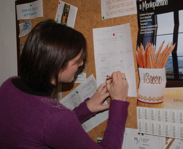 La secretaria de la escuela ofrece apoyo constante y activo a los estudiantes, asesorándolos en su elección de alojamiento o planificando sus viajes. Siendo un centro de actividad turística, la ciudad mantiene un estilo de vida relajado y amigable y, sobre todo, es realmente acogedor para los visitantes extranjeros. Por todas estas razones, estamos convencidos de que Montepulciano e Il Sasso ofrecen el lugar ideal para estudiar la lengua y la cultura italianas. La prueba de esto está en la gran cantidad de estudiantes que regresan año tras año.